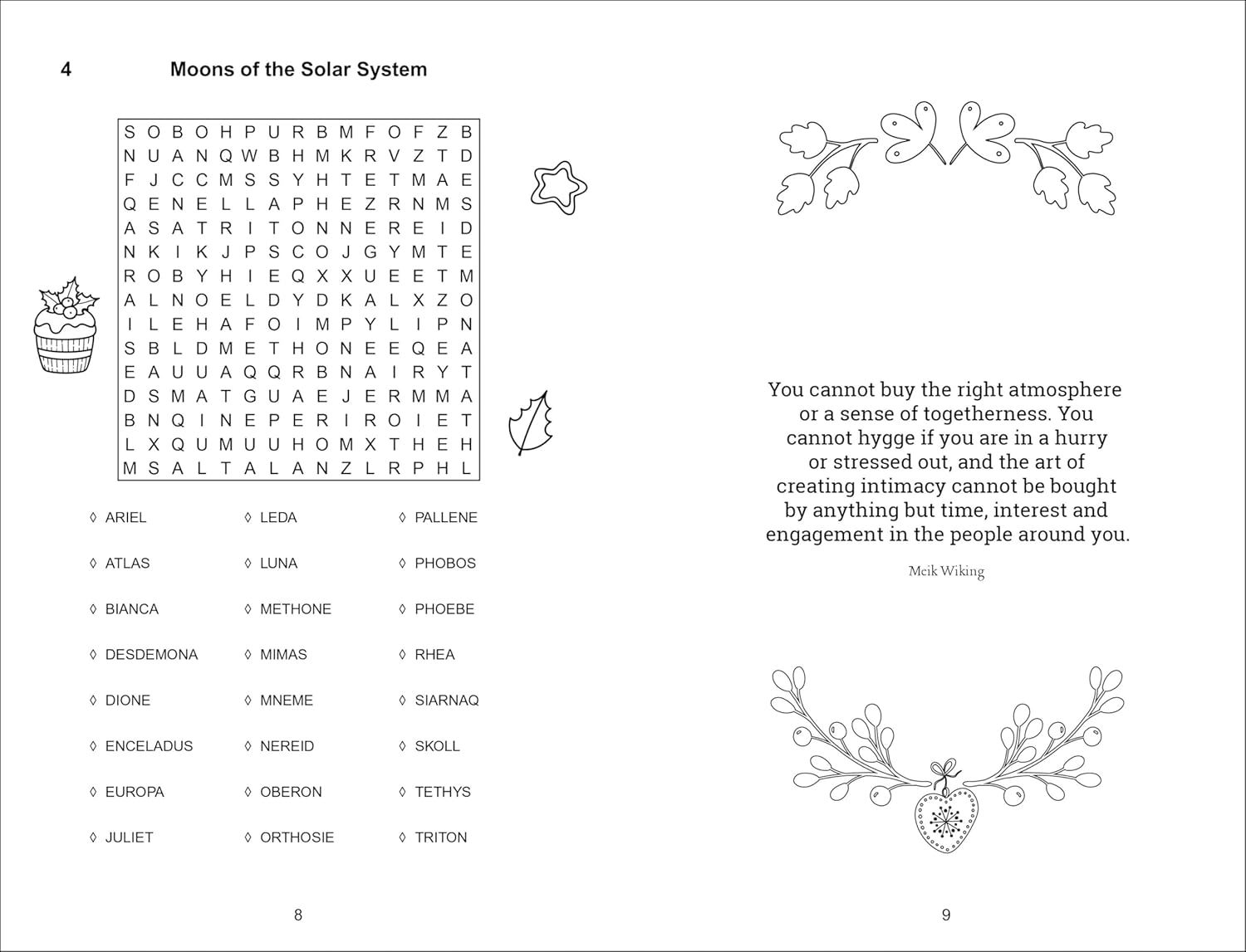 Kirja sisältää yli 100 sanahaku-pulmaa, jotka on taitavasti sijoitettu inspiroivien sitaattejen lomaan. Teema ammentaa skandinaavisesta hygge-hengestä: lämmin koti, kynttilänvalo ja rauhalliset illat. Tämä luo täydellisen tunnelman mitä rentouttavimmalle ajanvietolle.