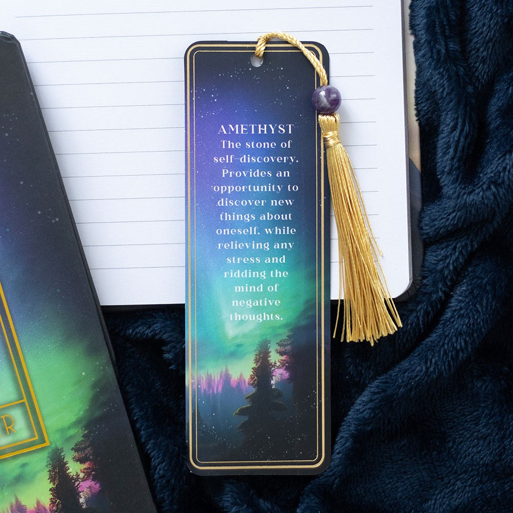 Whether gifted to a favourite book lover or tucked between the pages of a fantasy novel, this tassel bookmark is the perfect companion for getting lost in one's imagination. Features an amethyst bead to symbolise self-discovery and a matching message on the reverse.